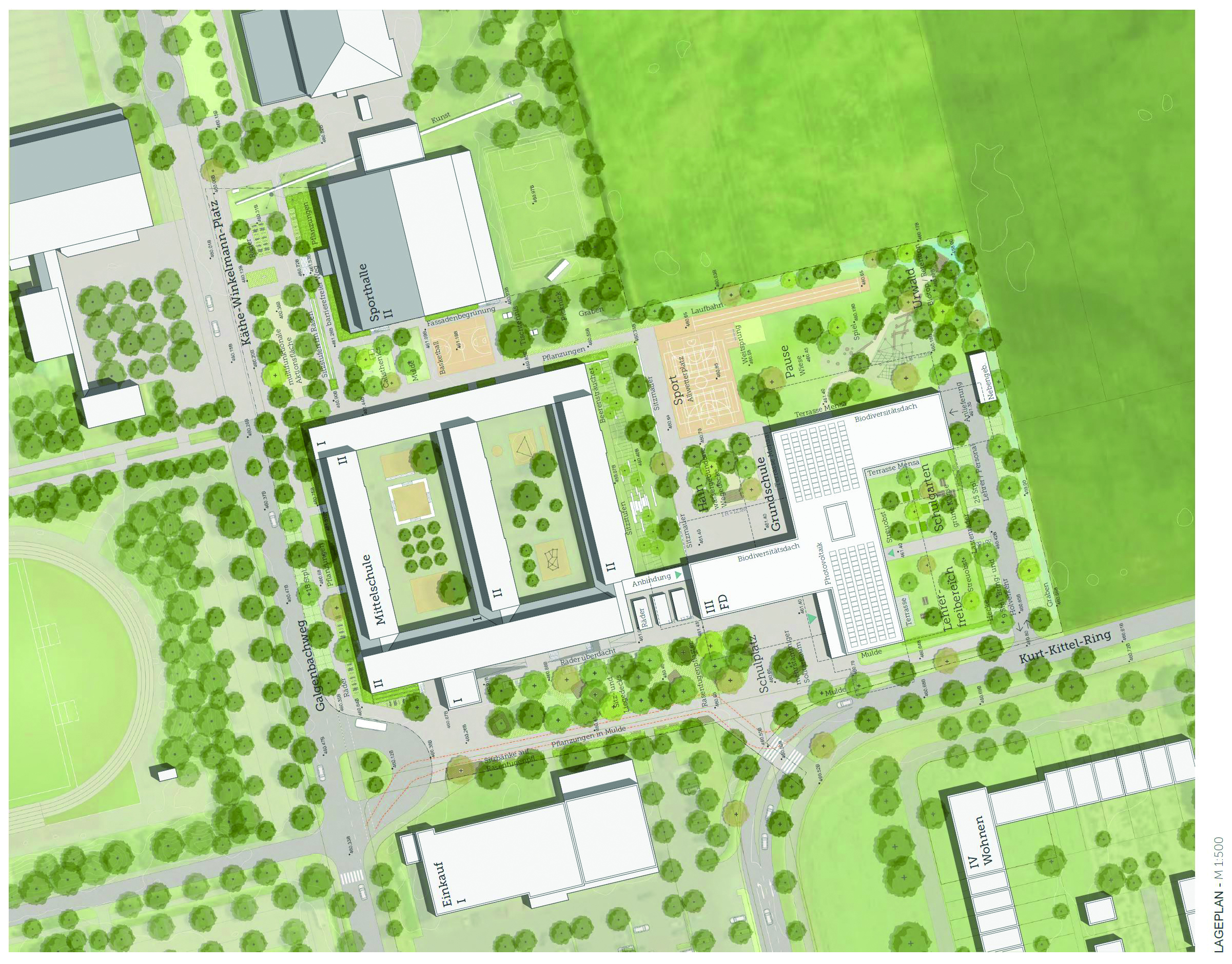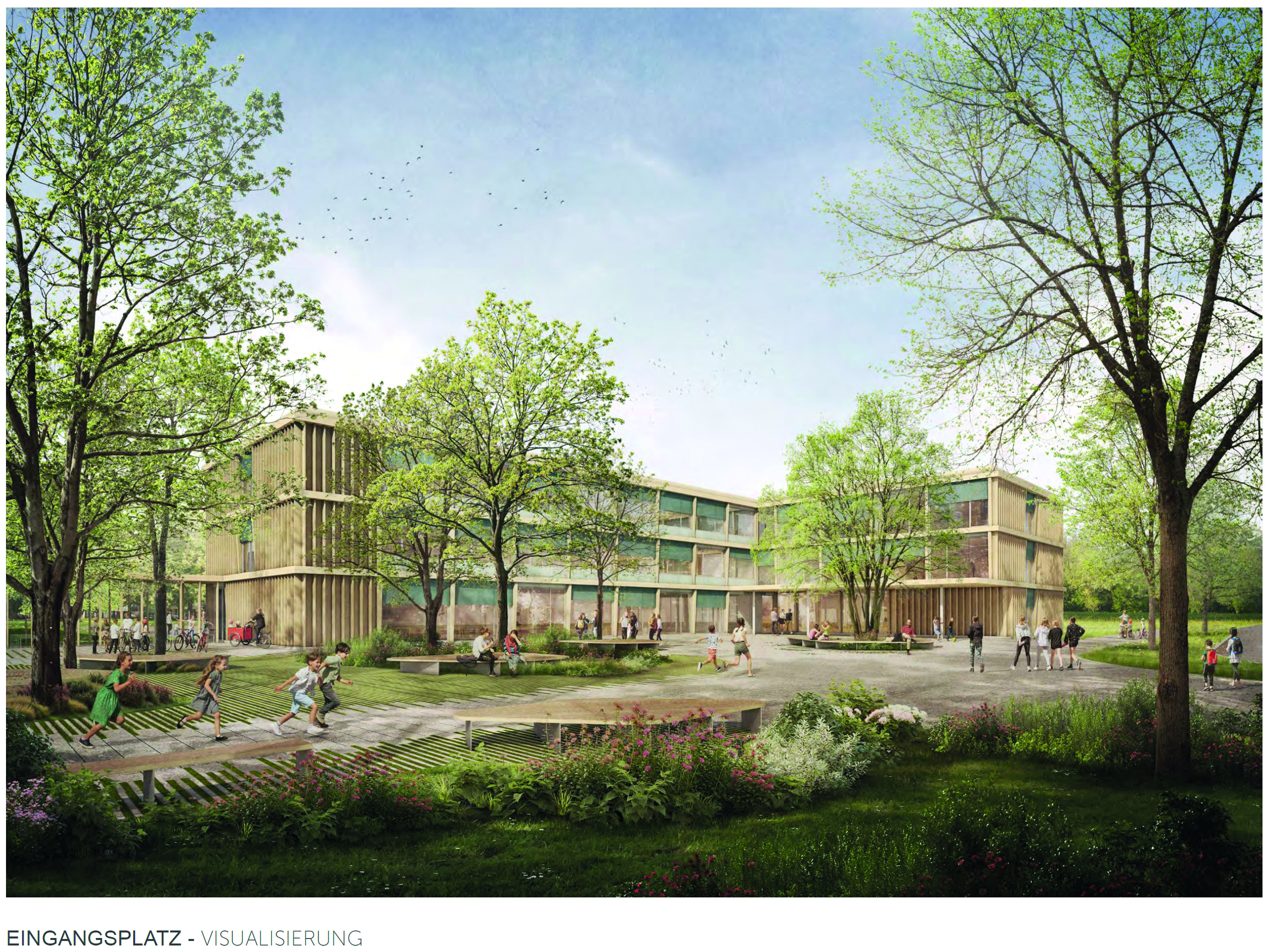 Das 3-flügelig geplante Gebäude der neuen Grundschule ist vergleichbar mit einer Windmühle, bei der die drei Flügel um eine Mittelachse angeordnet sind. Im Erdgeschoß befinden sich im Nordflügel die Aula mit den Mehrzweckräumen sowie die witterungsgeschützte Anbindung an das Mittelschulgebäude. Im Westflügel sind Räume für die Lehrkräfte sowie das Sekretariat vorgesehen und im Südflügel soll die Mensa entstehen. Jedes der beiden Obergeschosse umfasst im Nord- und Südflügel eine „Lerneinheit“, d.h. Klassen- und Gruppenzimmer, während der mittlere Flügel für Ganztags- und Werkbereich vorgesehen ist.