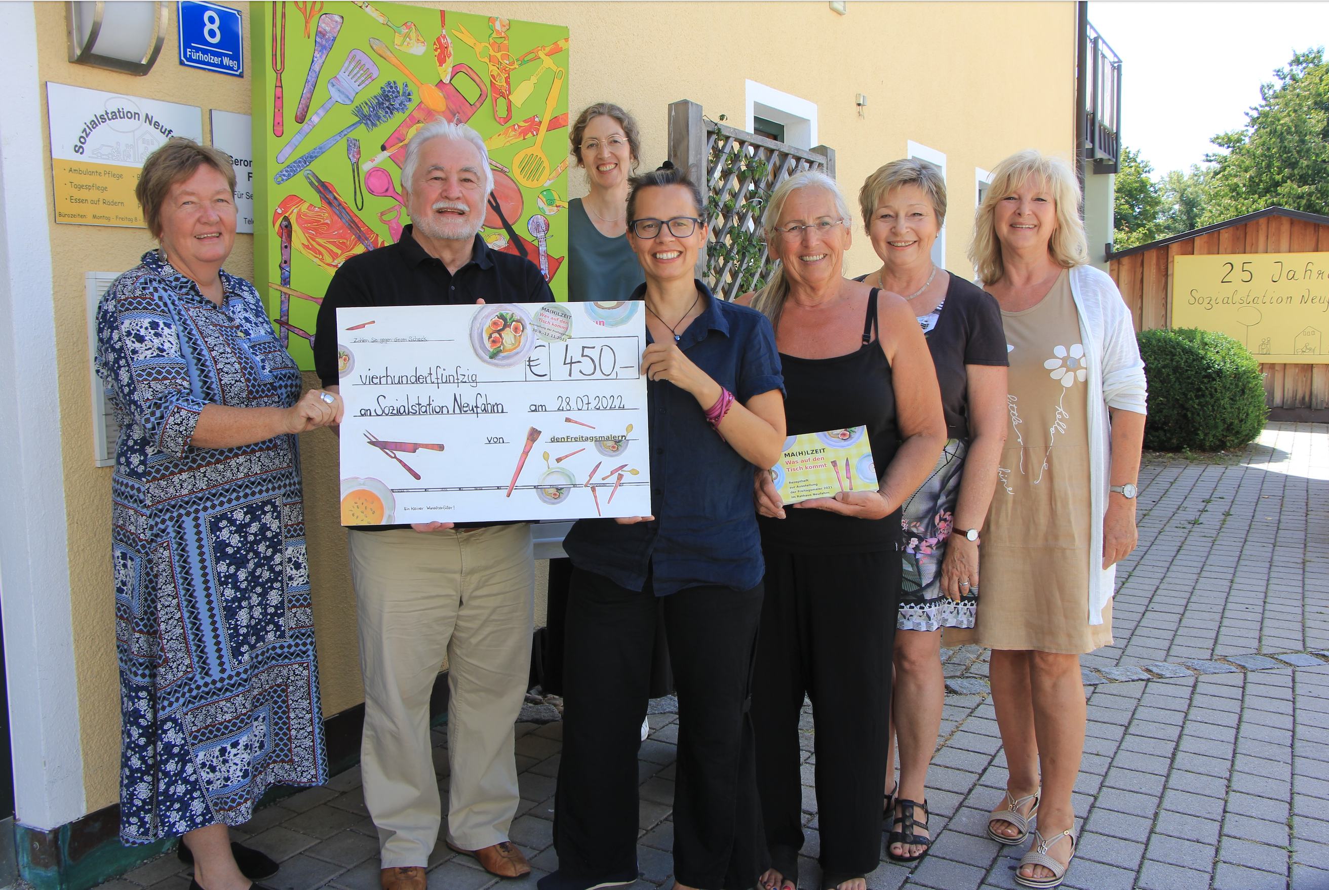 „Durch den Verkauf erzielten wir insgesamt 450 Euro“, berichtet Ines Seidel, die die Gruppe leitet, „und dieser Betrag soll der Sozialstation Neufahrn zugutekommen.“ Zur Spendenübergabe am 28. Juli brachten die Vertreterinnen der Gruppe Freitagsmaler nicht nur den Scheck mit, sondern auch das Gemeinschaftswerk „Küchengeräte“, das in der Ausstellung zu sehen war.