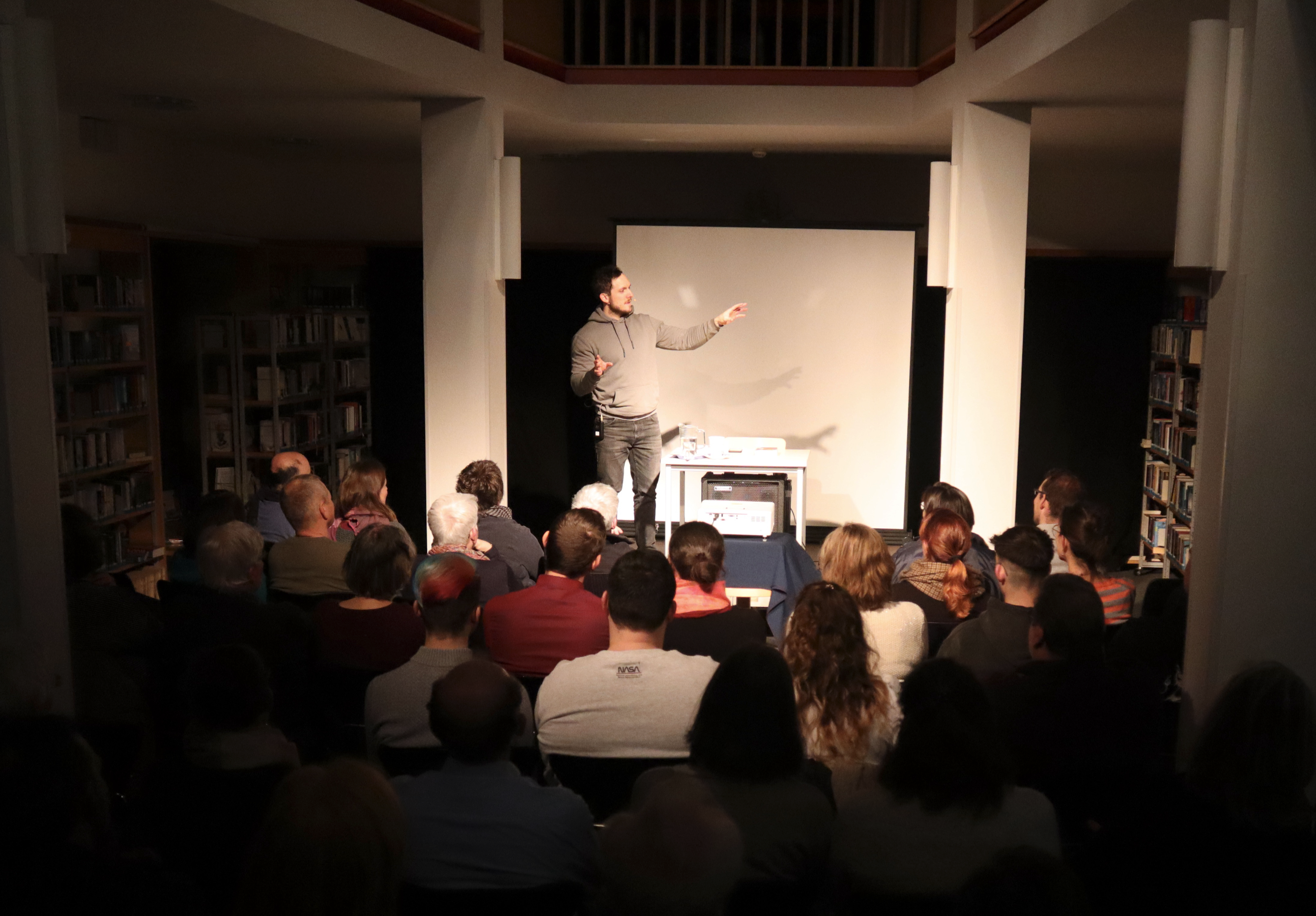 Michaela Reidel, die Leiterin der Gemeindebücherei Neufahrn hatte einen Abend angekündigt mit Comedy, Gesprächen, Poetry Slam, interaktiven Elementen und natürlich Passagen aus dem Buch: „Von hier betrachtet sieht das scheiße aus“. Max Osswald will mit seinem Debütroman, den Nerv einer ganzen Generation treffen, die heute nicht mehr so optimistisch in die Zukunft blickt. In der ausverkauften Gemeindebibliothek erfüllte der Autor alle angekündigten Punkte mit hohem Unterhaltungswert, dabei kurzweilig, mit tiefgründigem Humor und gleichzeitig einer rasiermesserscharfen Analyse der Hoffnungslosigkeit. Max Osswald stellt im ersten Kapitel seines Romans seinen Protagonisten Ben Schnieder (29) vor, dem das Leben nichts mehr zu bieten hat und der deshalb beschließt „sich das Leben nehmen zu lassen“. Ein Auftragsmörder soll den Job innerhalb von 50 Tage erledigen. Als nächstes beantwortete der Romanautor die Fragen der Zuhörer. Das Interesse galt seinem Einstieg in die Schriftstellerei bzw. wie ein Roman entsteht. Osswald berichtete, dass im Jahr 2017 „eine etwas merkwürdige Veranstaltung, ein Speaker Event“, das auslösende Moment war. Unter den damaligen Zuhörern war eine Lektorin, die begeistert war und ihn aufforderte doch einmal einen Roman zu schreiben.