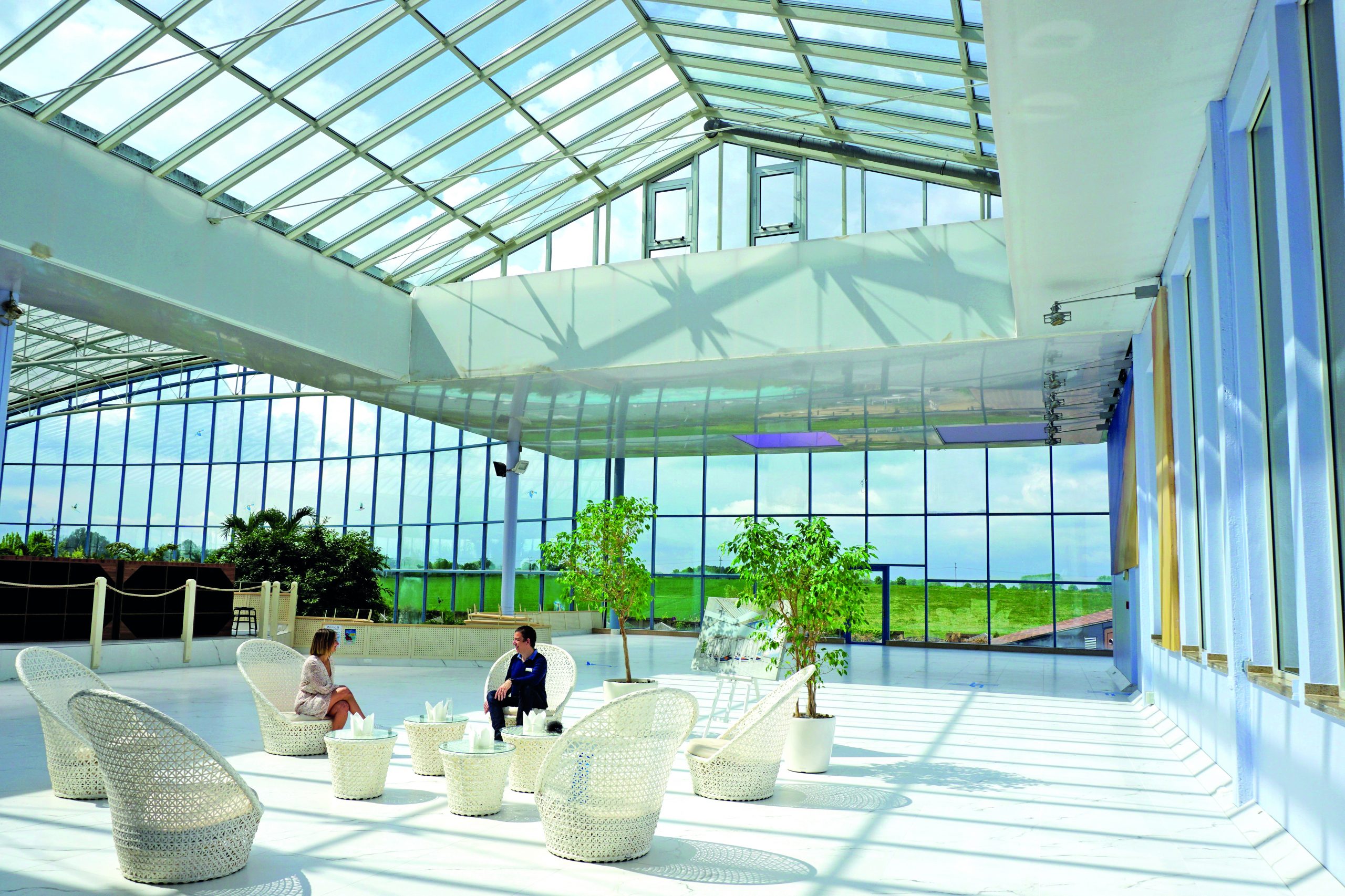 Auch das Herzstück der Thermenwelt, die 1999 eröffnete 10.000 m² große „Ur-Therme“, erfährt eine General-Überholung. Bis August sollen die Kuppel und weitere Dachflächen frisch gedeckt sein, dazu erneuern Fachfirmen die Badewasser- und Steuerungstechnik, Lüftungs- und Elektroanlagen. Bis Juni rechnet der Betreiber mit dem Ende der Ausbauarbeiten der Liegeflächen im Saunabereich, abhängig von der rechtzeitigen Lieferung des Baumaterials. Die zweistöckige „Sky Lounge“ mit 37 Himmelbetten und 40 weiteren Komfort- Doppelliegen, auf der darüber liegenden, sogenannten Panorama Empore, ist dann der neue Hot-Spot für Ruhesuchende zum „Chillen und Relaxen“. „Das sind hier rund 2.000 m² Marmorboden. Aufgrund der Pandemie suchen die Leute nach mehr Abstand, daher haben wir uns entschieden, den Bereich zu erweitern“, erläutert Maximilian Maier. „Im Bereich von 15 Euro für eine Komfortliege bis hin zu unserem Chalet Deluxe für 199 Euro ist in der Thermenwelt für jeden Geldbeutel etwas dabei.“