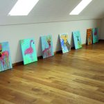 Umrahmt wurde die Jubiläumsfeier von einer Vernissage. Miriam DaSilva zeigte unter dem Titel „Mindscapes – Masken & Wahrheit“ zehn eindrucksvolle großformatige Acrylgemälde von Gesichtern, die sie als seelische Landschaften beschreibt. Die Künstlerin hat ihr Atelier in Fürholzen und konnte ihre Werke bereits mehrfach in Ausstellungen zeigen. Ihr künstlerisches Schaffen verbindet sie mit Malkursen für Kinder und Erwachsene. Bilder, die Kinder unter ihrer Anleitung gemalt hatten, waren am Sonntag ebenfalls im Gemeinschaftshaus zu sehen.