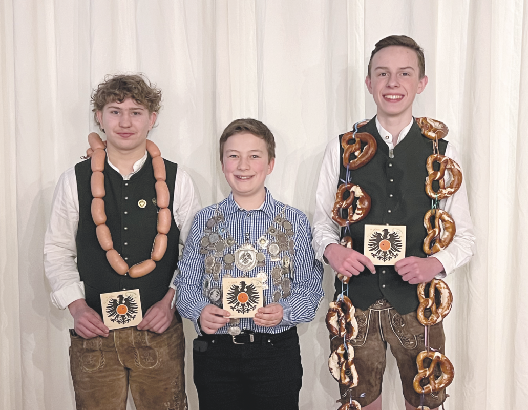 Im Mittelpunkt der Veranstaltung freilich standen traditionsgemäß die mit Spannung erwarteten Königsproklamationen. Mit 10 teilnehmenden Jugendlichen zeigte der Nachwuchs eindrucksvoll, wie lebendig die Schützentradition weiterhin ist. Die Leistungen konnten sich sehen lassen: Im Jugendbereich schoss sich Rafael Krauß –mit einem 310 Teiler an die Spitze und bekam von seiner Vorgängerin Jugendkönigin Charlotte Zellhuber die Königskette umgehängt. Im „königlichen Gefolge“  fand sich Wurstkönig  Kevin Balzer ( 510 Teiler)auf dem Vizeposten. Den dritten Platz des Brezenkönigs erzielte Mathias Riedl (610 Teiler).