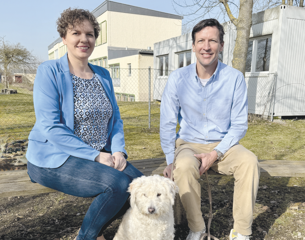 Rektorin Ina Fischbach und Konrektor Thomas Hartmeier mit Schulhund Niska. (Foto © Gemeinde Neufahrn)