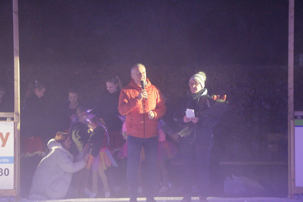 Auch in diesem Jahr lud der Marktplatz wieder zu einem winterlichen Sportvergnügen ein. Dichter Nebel wallte sowohl vom Himmel als auch aus der Nebelmaschine, als am 19. Dezember Bürgermeister Franz Heilmeier und Kulturreferentin Silke Rößler offiziell die Eisbahn eröffneten.