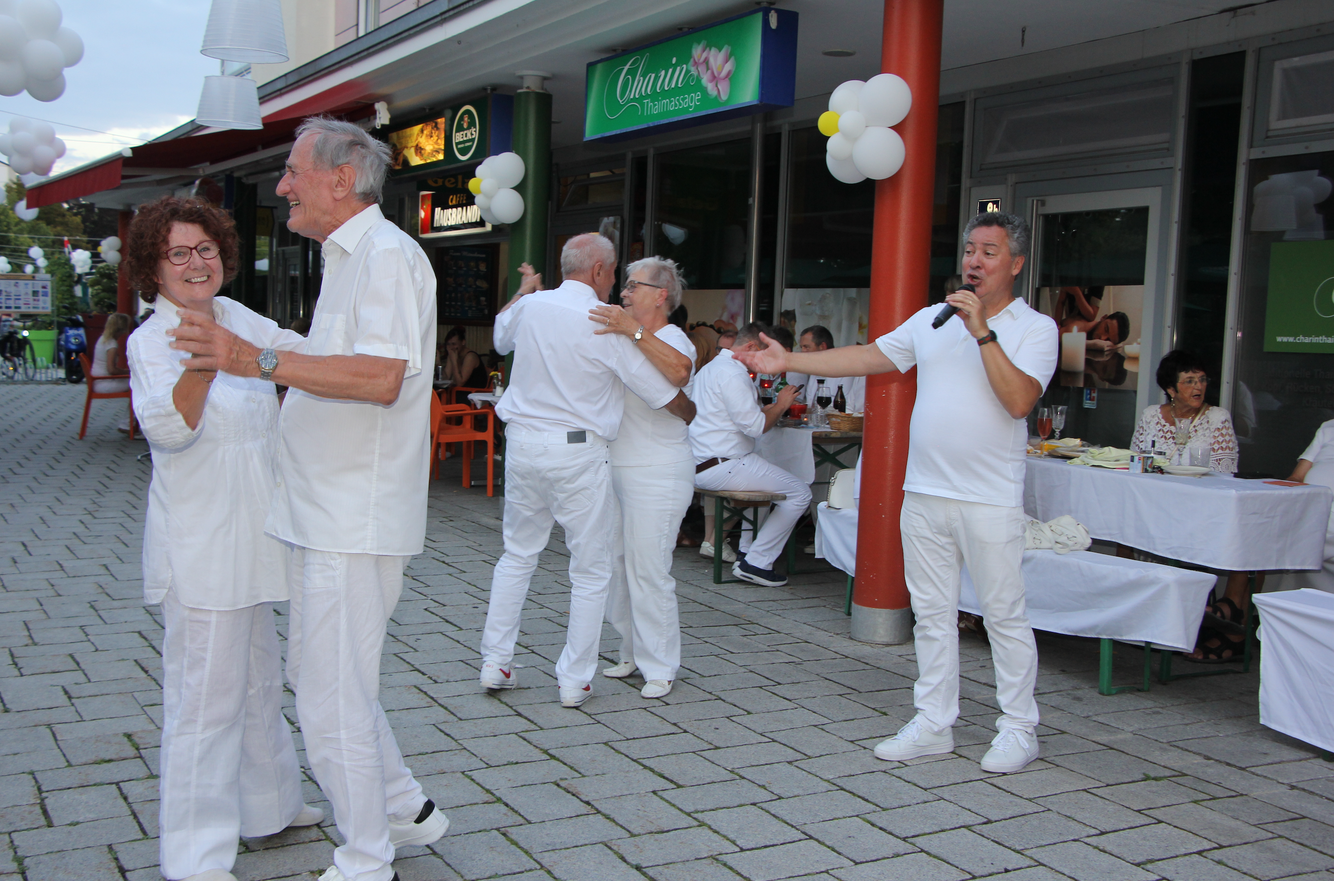 Auch der Marktplatz war „ganz in weiß“ und mit Luftballons und Lampions festlich dekoriert. Das südliche Flair wurde perfekt, als dann Giuseppe Del Duca seine Stimme erklingen ließ. Der Tenor bezauberte sein Publikum nicht nur mit altbekannten italienischen Schlagern wie „Volare“, „O sole mio“ und den „Capri-Fischern“, sondern auch mit seinem Charme, wenn er beim Singen tief in die Augen der Damen blickte. Ob da nicht manches Herz dann doch etwas höherschlug? Heuer war er sogar von einem kleinen Fanclub umgeben, dessen (weibliche) Mitglieder ihm eifrig behilflich waren, Notenständer und Kabel zu transportieren. Seine Lieder luden nicht nur zum Mitsingen ein, so manches Pärchen drehte dazu auf dem Marktplatzpflaster eine kleine Walzerrunde.
