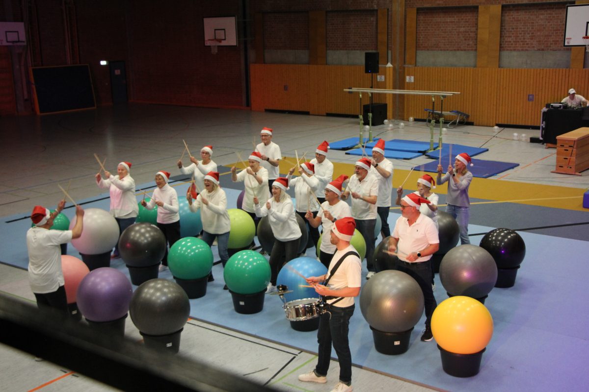 Schwarz gekleidet und mit „Feenlichtern“ (LED-Lichterketten) umwunden, dazu bunt leuchtende Hula-Hoop-Reifen – zauberhaft und geheimnisvoll war die Tanzvorführung der Damen aus der Abteilung fit & gesund. Es folgte der „Einzug der Gladiatoren“, in diesem Fall der Herzsportler. Pezzibälle und Trommelstöcke waren an diesem Abend ihre „Sportgeräte“ und sie begeisterten das Publikum auch heuer wieder mit ihrer Show „Drums Alive“.