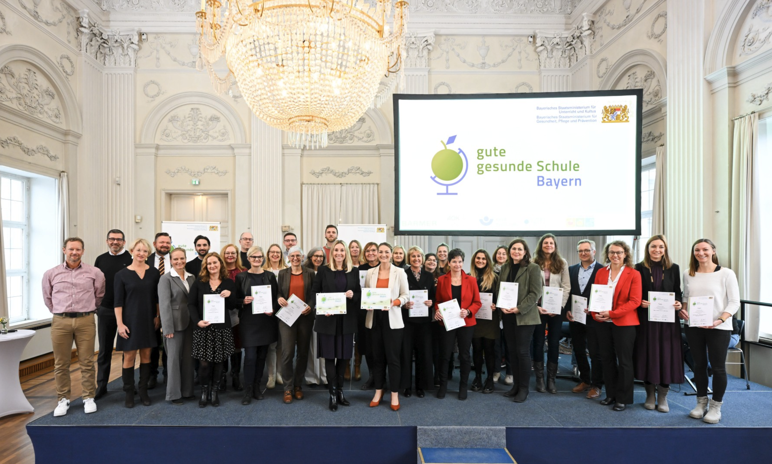 Kultusministerin Anna Stolz und Gesundheitsministerin Judith Gerlach haben am 29. November 2023 244 Schulen in der Residenz in München dafür ausgezeichnet, dass sie erfolgreich am „Landesprogramm für die gute gesunde Schule Bayern“ teilgenommen haben. Mehr als 150 Schulen – darunter auch das Oskar-Maria-Graf-Gymnasium Neufahrn – erhielten die Auszeichnung bereits zum wiederholten Mal. Stellvertretend für die Schulfamilie nahm Schulleiter Dr. Stefan Bäumel die Auszeichnung entgegen.