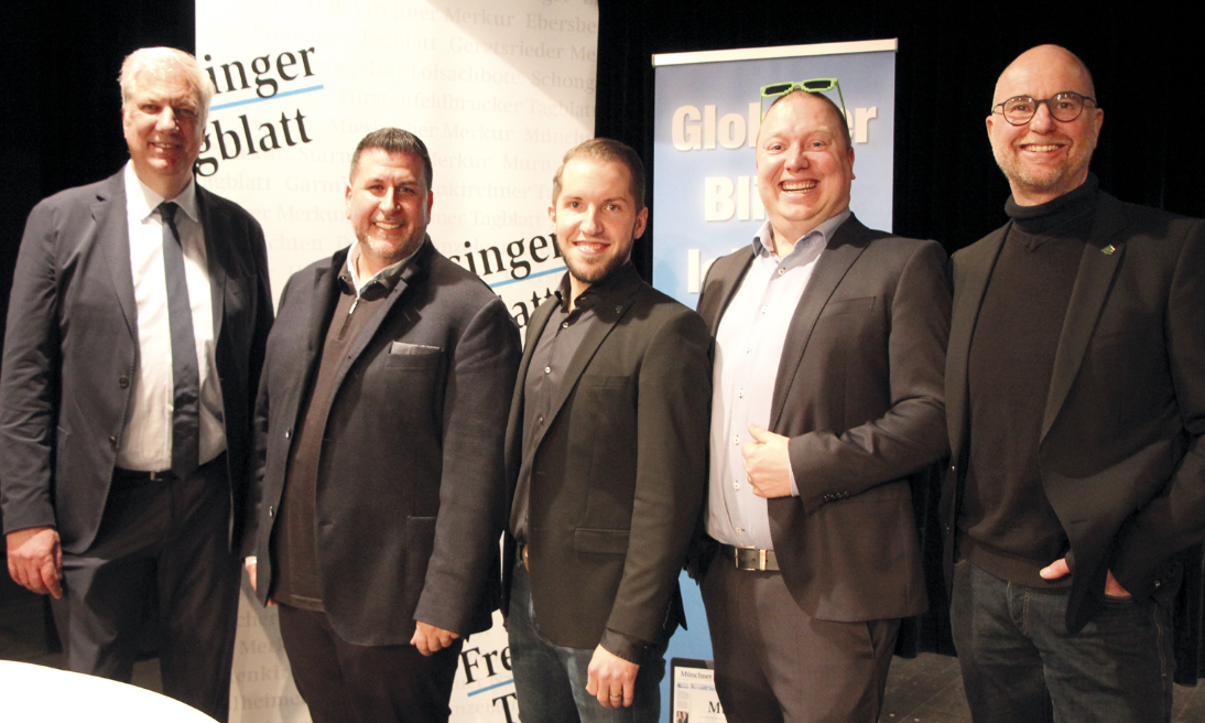 Auf der Bühne waren anwesend: Marc Bosch (BaB), Wolfram Braun (FW), Maximilian Heumann (SPD), Ozan Iyibas (CSU) und Christian Meidinger (Grüne). Felix Bergauer (ÖDP) nahm per Video teil. Bastian Amann (Tagblatt) moderierte die Veranstaltung.