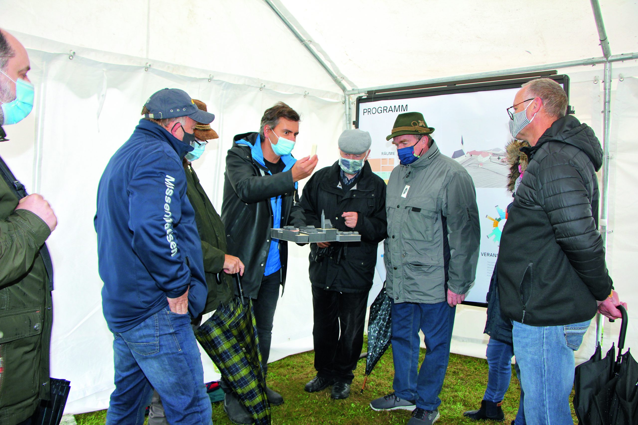 Alexandra Steurer, Verwaltungsleiterin des Pfarrverbands Massenhausen, führte kurz durch die Historie der Planungen für das neue Pfarrheim, und Architekt Christian Zöhrer des Münchner Architekturbüros Westner Schührer Zährer stellte den Ablauf des Workshops näher vor, bei dem selbstverständlich auch die Hygieneregeln eingehalten wurden. Im Pfarrgarten waren, wasserdicht verkleidet, vier Stationen aufgebaut. Hier konnte man sich über die historische Entwicklung des Ortes informieren, man durfte mit Styropor, Plastilin und Klebstoff eigene Ideen modellhaft darstellen. „Trauen Sie sich“, riet der Architekt. „Visionen“ zum zukünftigen Neubau waren in einem dritten Pavillon zu sehen und in der vierten Station konnte man eigene Vorschläge oder auch kritische Bemerkungen aufschreiben und in die „Ideen-Box“ einwerfen.