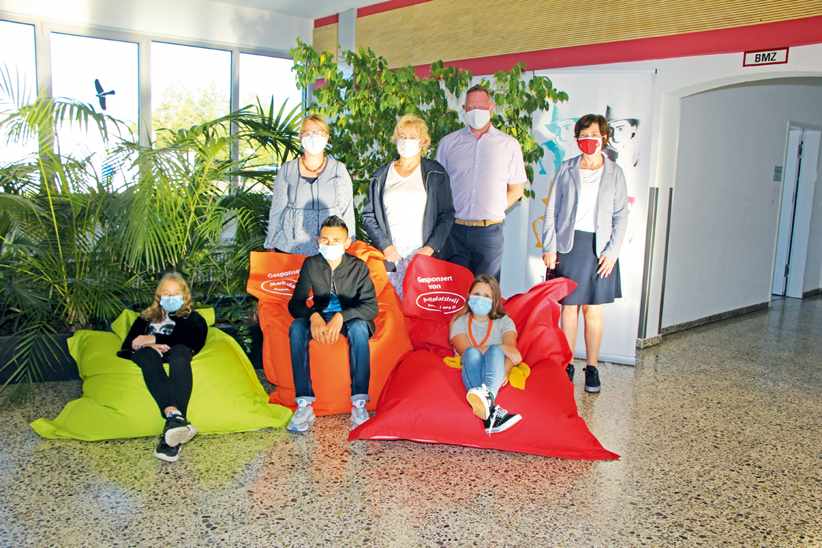 Dass man in den bunten Sitzsäcken – trotz Maskenpflicht – gut chillen kann, finden nicht nur (v.li.) Caitlin, Diego und Julie-Ann, sondern auch Silke Rößler, Christa Kürzinger und Frank Langwieser vom Marktplatztreff und Birgit Bruckmann, pädagog. Leitung OGT.