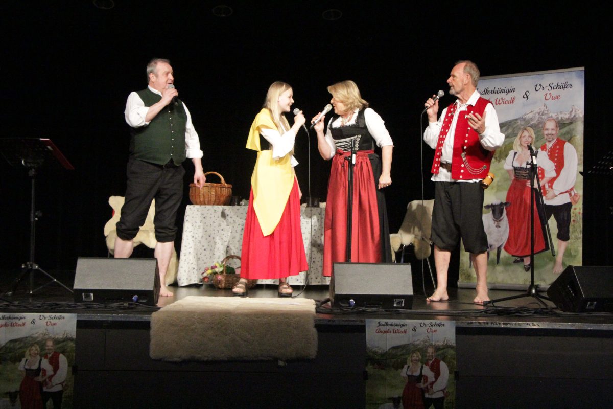 Das Publikum bekam ein vielfältiges Programm geboten, dessen Herzstück die Lieder von Angela Wiedl waren. Die „bayerische Jodelkönigin“ jodelte, was das Zeug hielt, oft solo, aber auch gemeinsam mit Tochter Gina, sie sang „Mama Teresa“, ein Lied, das sie für Mutter Teresa geschrieben hatte. Nicht fehlen durfte eines ihrer bekanntesten Lieder, „Herzklopfen“. Vielfach wurde von der Schäferfamilie über Heimat, Berge und Herz gesungen, aber auch die Liebe und das Glück kamen im Programm nicht zu kurz, sogar die schöne Stadt Barcelona wurde mit spanischem Temperament gepriesen, und Nesthäkchen Gina stellte der „besten Mama der Welt“ die Frage „Sag mir, wo ist der Himmel?“