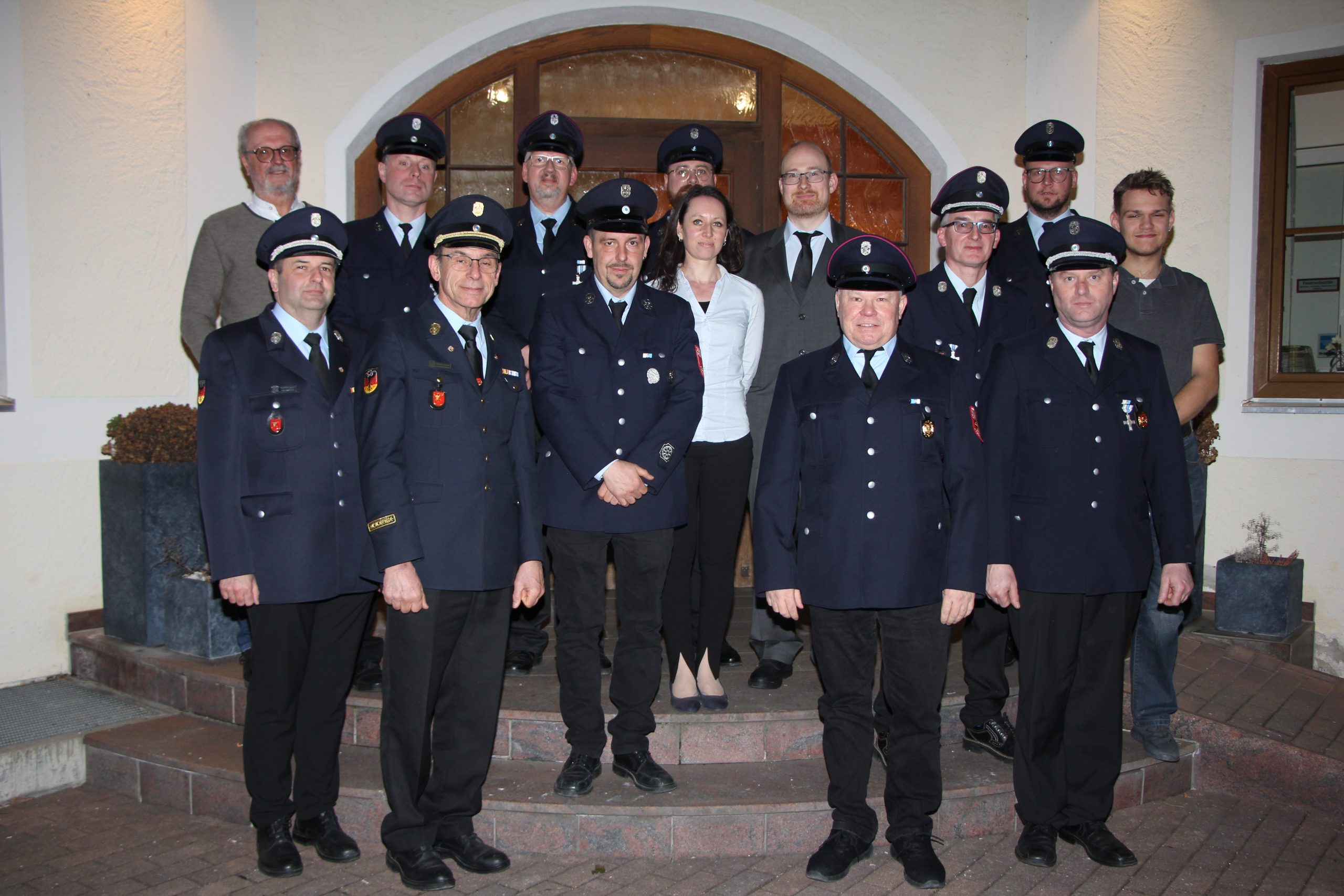 (v.li. hinten) Josef Eschlwech, Christian Knoll (Kassier), Christian Bachmeier, Julian Lindermeier (1. Vorstand), Marina Kiene, Maximilian Kiene, Leonhard Bergmayr, Michael Götz (2. Vorstand), Ludwig Keller; (vorne) Reinhold Jasch (Kreisbrandmeister), Helmut Schmid (Kreisbrandinspektor), Stefan Sedlbauer (2 Komm.), Christian Moosrainer (Schriftf.), Stefan Knoll (1. Komm.)
